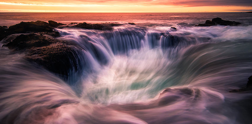 清晨與上午繼續(xù)Face Rock Viewpoint拍攝,結(jié)束后前往雷神之井,也稱“海底之門”。俄勒岡州CapePerpetua的“地牢的大門”,位于奧勒岡海岸線 101 號公路 Cape Perpetua 旁邊。這座雷神之井是一座長約五六公尺的 Sinkhole 沉洞,每天兩次的漲潮,讓這座巖石大洞幾乎位于海平面左右,隨著海浪一波一波,這座石洞一下子出現(xiàn),一下子淹沒在海水之中。在適度的潮汐和強大的拍岸的海浪情況下,流水創(chuàng)造了該地夢幻般的風(fēng)景。尤其在夕陽黃昏時前來,面對西邊正好可以看到夕陽落入海平面,映照的太陽的金光,這座海洞就宛如一座通往天國的洞穴。Thor's Well 更被選為全美最美 29個死前必去景點之一。